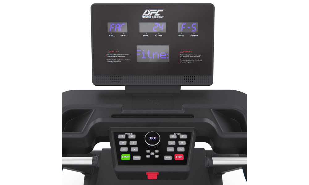 Максимальный вес пользователя — 180 кг. Беговая дорожка оснащена мощным двигателем с пиковой мощностью 6 л.с., что гарантирует стабильную работу даже при максимальных нагрузках. Просторное беговое полотно размером 165 х 62 см обеспечивает комфорт во время тренировки, а прочная дека толщиной 25 мм и беговое полотно 2,8 мм делают дорожку долговечной и устойчивой.