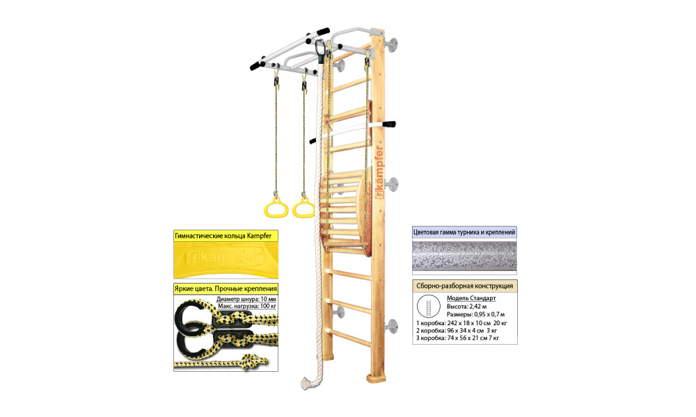 Крепкий металлический турник выдерживает нагрузку до 120 кг, подходит как детям так и взрослым. Навесное оборудование Kampfer на прочных тросах выдерживает нагрузку до 100кг. Особенностью пристенной шведской стенки Kampfer Helena Maxi является шесть креплений к стене, в отличие от обычных пристенных моделей, у которых только четыре крепления.Увеличение количества креплений до шести обеспечивает самые надежные и максимально безопасные занятия на ДСК Kampfer.