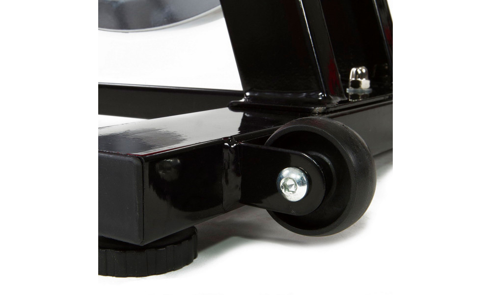 Для перемещения тренажера в помещении установлены колеса. Фиксация ног в педалях с помощью резиновых ремней с регулировкой. Удобные подлокотники на руле.